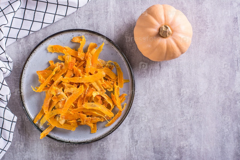 Аппетитные вегетарианские десертные тыквенные чипсы на тарелке на столе сверху