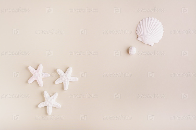 Концепция летнего пляжного отдыха белая морская звезда и ракушки на пастельном фоне