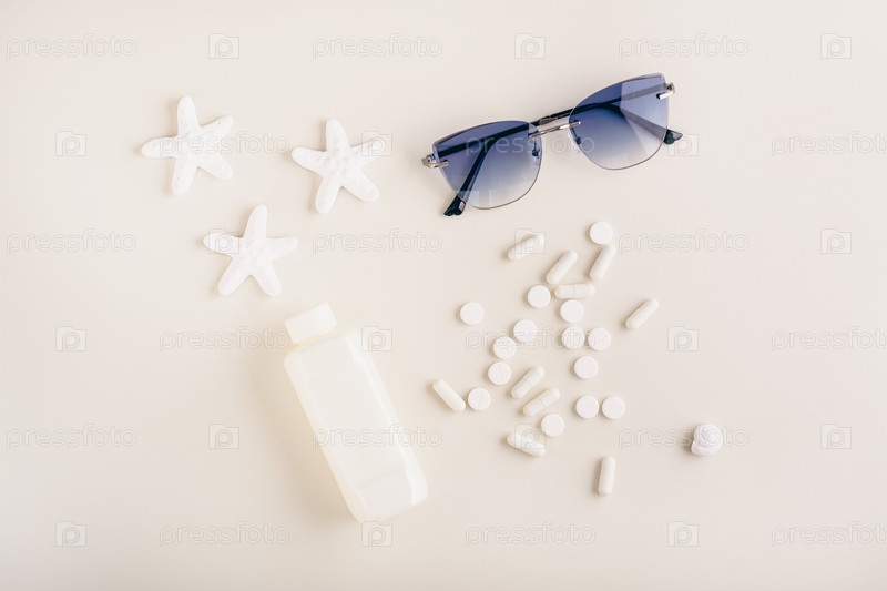 Солнцезащитные добавки для кожи, солнцезащитные очки, морские звезды и ракушки на бежевом фоне