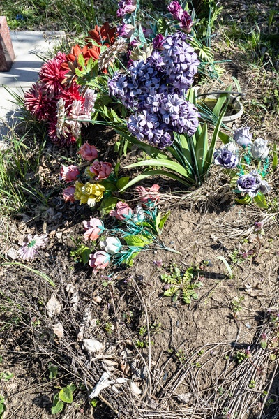 Старые искусственные цветы на могиле на кладбище в солнечный день