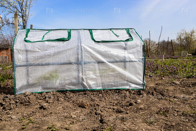 Небольшая складная теплица, покрытая пленкой, на земле в деревенском саду в солнечный весенний день
