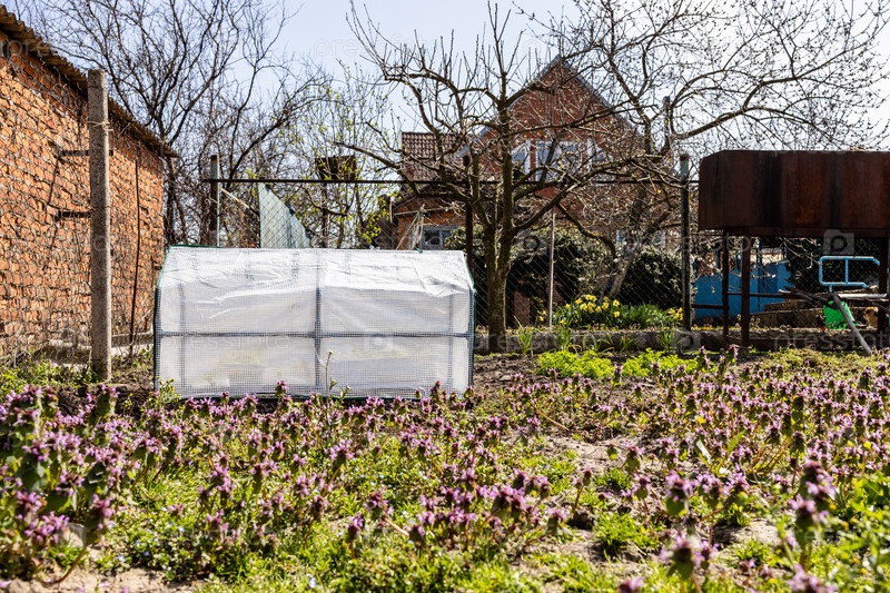 Маленькая мобильная пленочная теплица в деревенском саду в солнечный весенний день