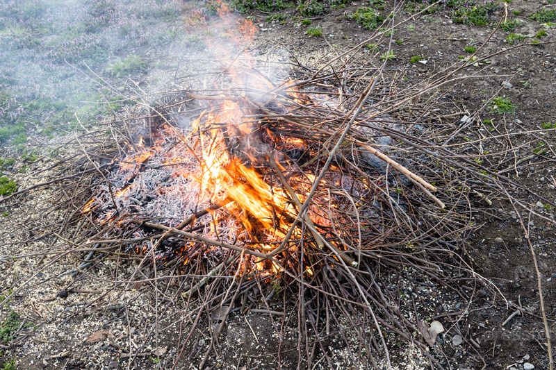 Сжигание обрезанных ветвей и веток фруктовых деревьев в деревенском саду весенним вечером