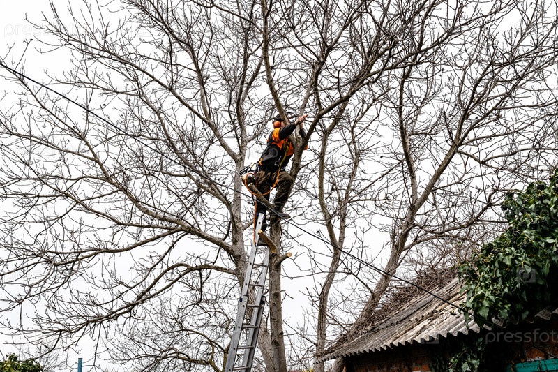 Рабочий пилит ветки высокого дерева в сельском дворе