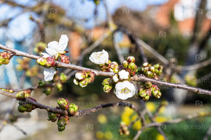 Ветка с бутонами и цветами крупным планом на заднем дворе