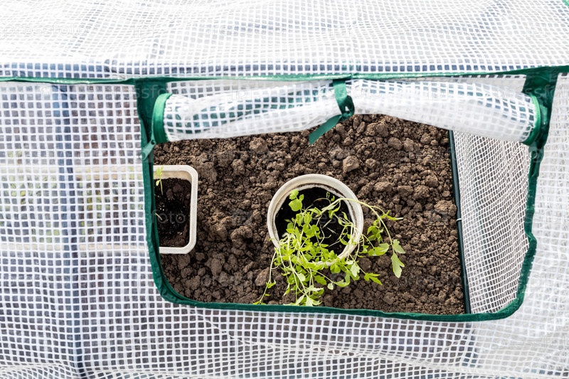 Вид на рассаду томатов в горшке в открытой теплице
