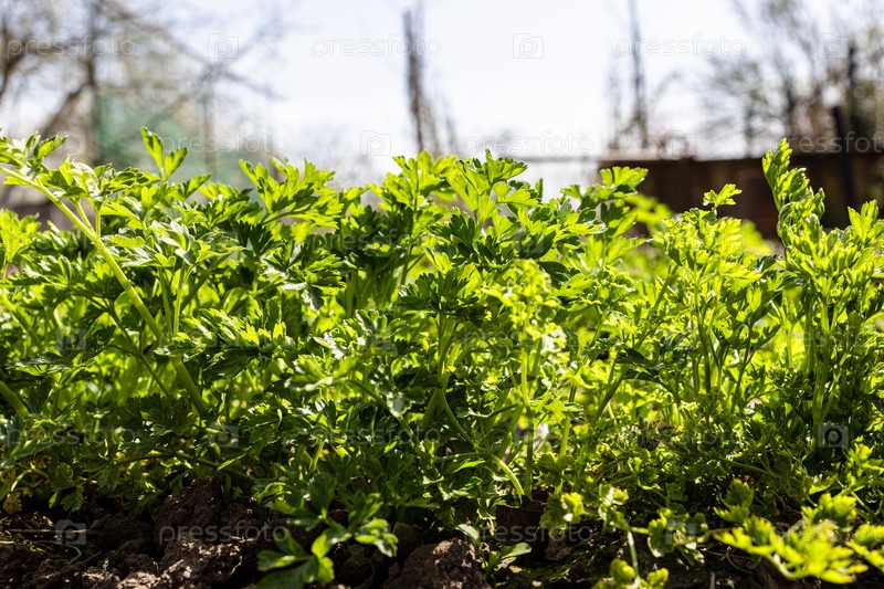 Залитая солнцем зеленая свежая петрушка крупным планом в саду