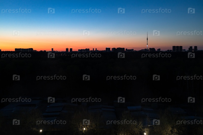 Рассвет над горизонтом города с телебашней весной