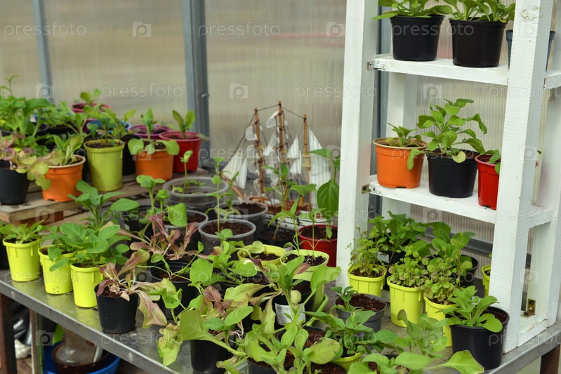 Натюрморт с саженцами и ростками растений в горшках в теплице, садоводстве и сельском хозяйстве. Винтажный фон