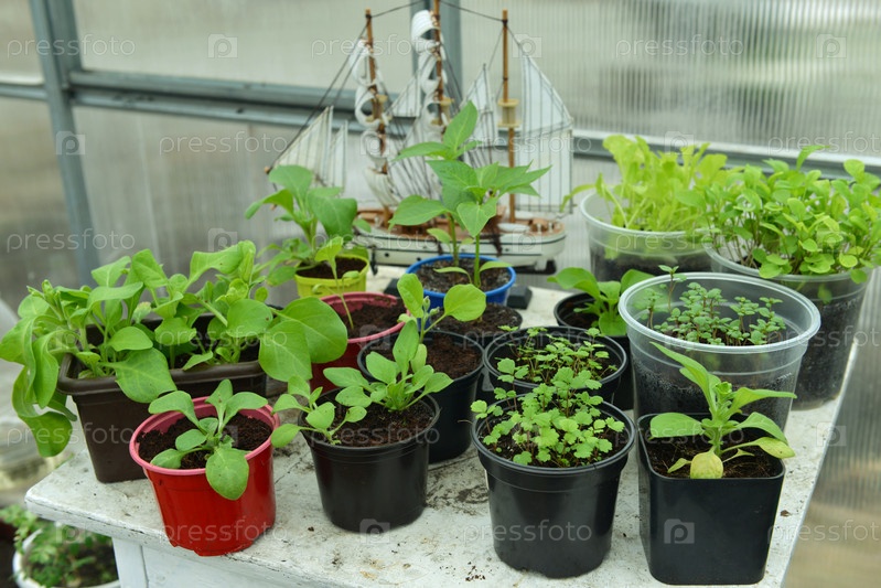 Натюрморт с саженцами и ростками растений в горшках в теплице, садоводстве и сельском хозяйстве. Витажный фон