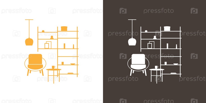 Иконка дизайна интерьера с креслом, журнальным столиком, стеллажами, люстрой