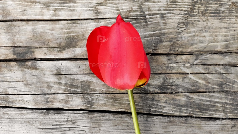 Один красный тюльпан отдельно на деревянном фоне
