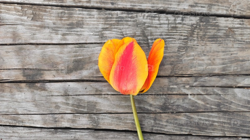 Один оранжевый красно-желтый тюльпан изолировано на деревянном фоне. Весна