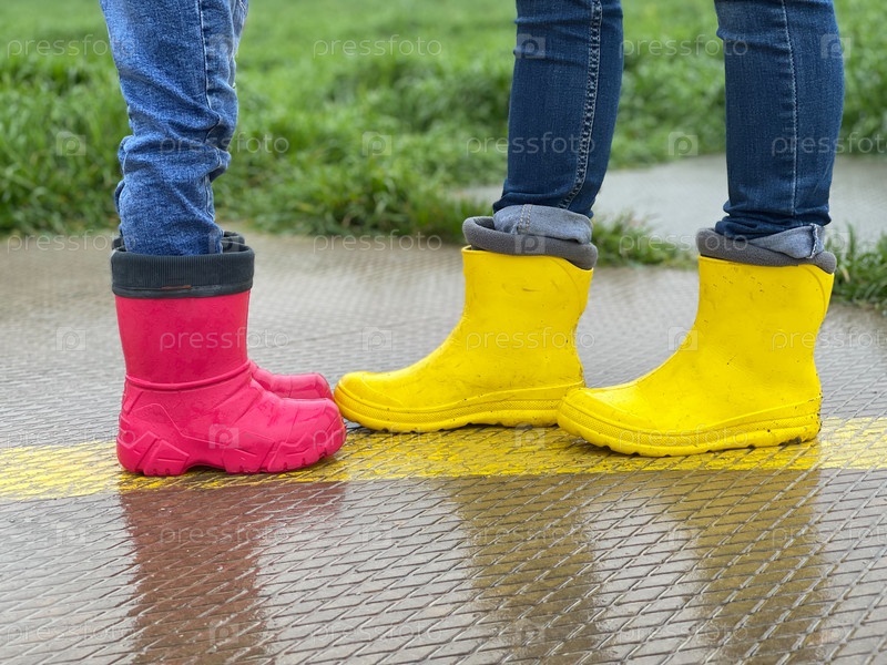 На желтой линии розовые детские резиновые сапоги на улице рядом с жёлтыми резиновыми ботинками мамы. ноги малыш и мама стоят после дождя