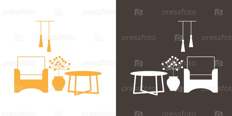 Интерьер гостиной с креслом, журнальным столиком, растением и лампой. Плоская иконка