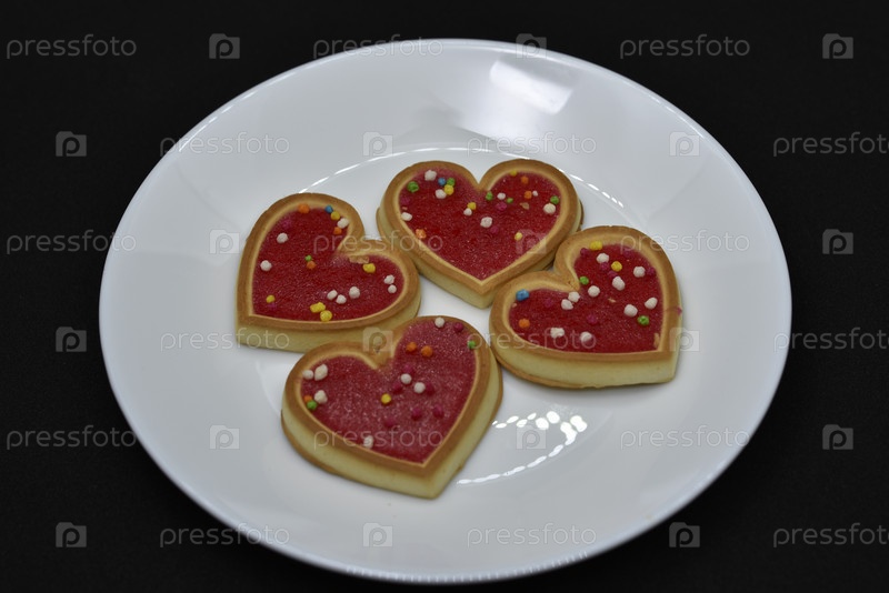 Печенье красного сердца на белой тарелке. Сладкое печенье с сердцем