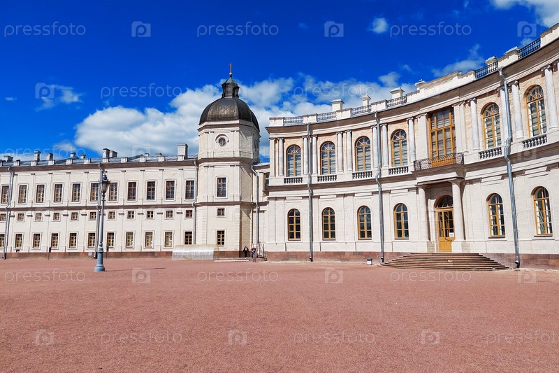 Гатчинский дворец. Дворцовая площадь и главный вход. Памятник архитектуры, Императорский дворец в Ленинградской области. 25 июля 2022 г., Россия, г. Санкт-Петербург