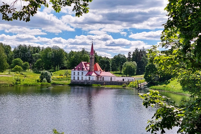 Приоратский дворец на берегу Черного озера в Гатчине. Гатчинский дворец получил статус объекта Всемирного наследия ЮНЕСКО в 1990 году. 25 июля 2022 года, Россия, Санкт-Петербург
