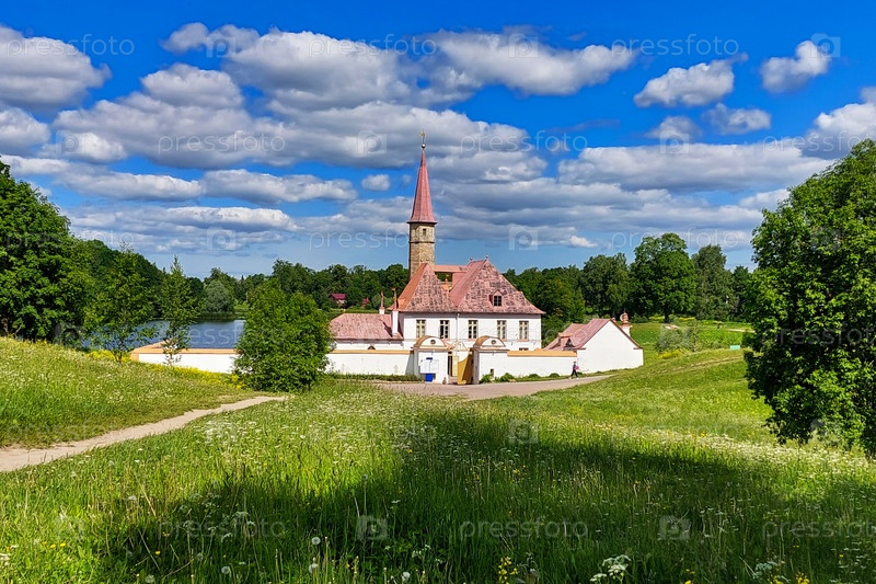Приоратский дворец на берегу Черного озера в Гатчине. Гатчинский дворец получил статус объекта Всемирного наследия ЮНЕСКО в 1990 году. 25 июля 2022 года, Россия, Санкт-Петербург