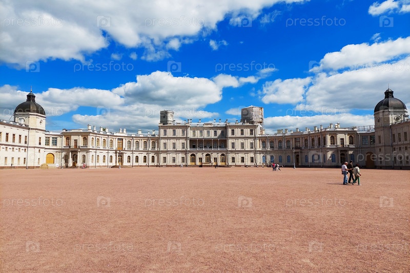 Гатчинский дворец. Дворцовая площадь и главный вход. Памятник архитектуры, Императорский дворец в Ленинградской области. 25 июля 2022 г., Россия, г. Санкт-Петербург