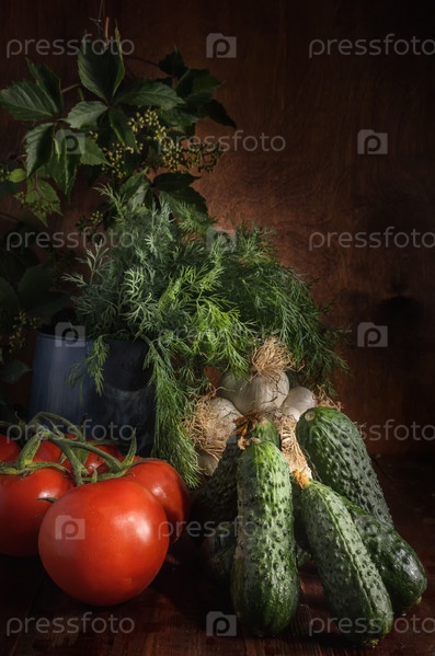 Спелые овощи на темном деревянном фоне в деревенском стиле