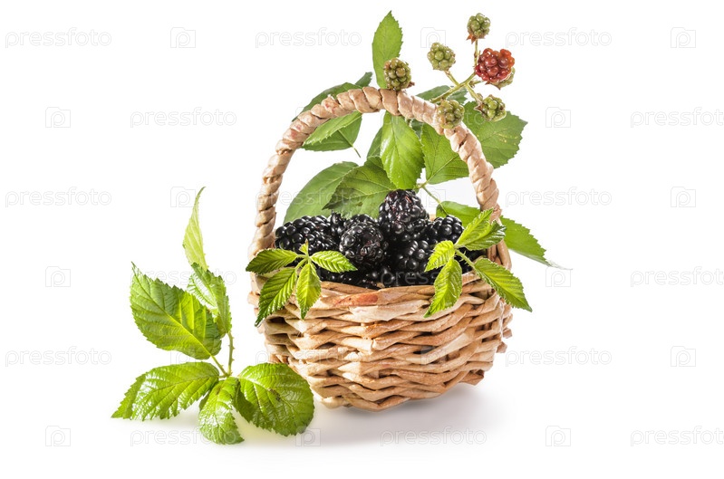 Спелая ежевика с листьями на белом фоне с мягкой тенью