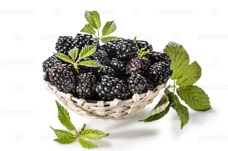 Спелая ежевика с листьями на белом фоне с мягкой тенью