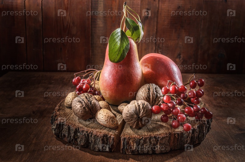 Спелая груша и куча ягод калины на темном деревянном фоне в деревенском стиле