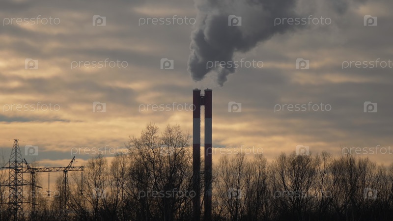 Высокая труба с едким дымом на фоне высоких деревьев без листвы Высокая труба с едким дымом на фоне высоких деревьев без листвы