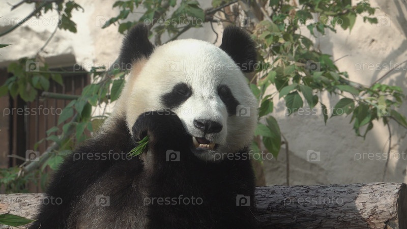 Панда ест сочные бамбуковые ветки на обед