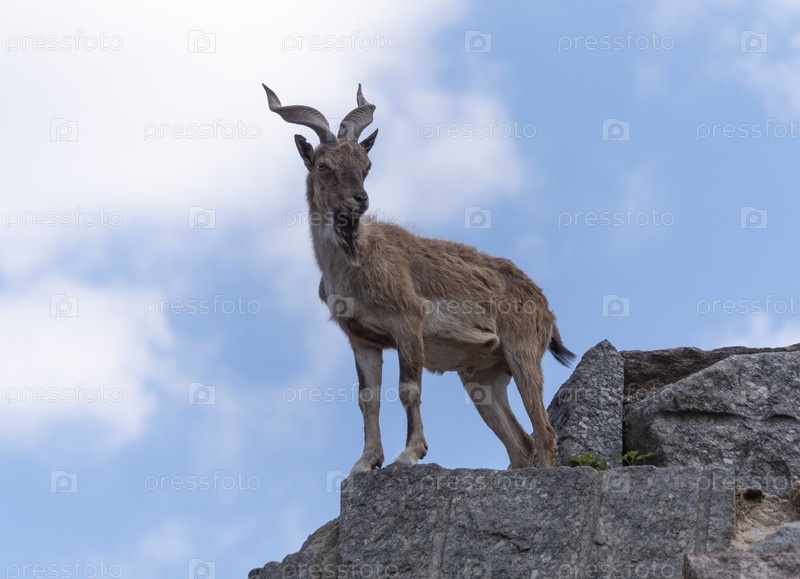 Красивая горная коза со спиральными длинными рогами на фоне скал
