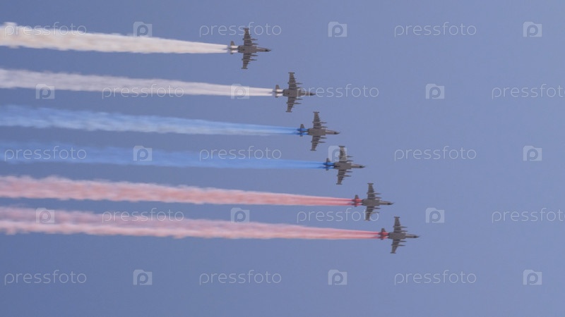 Штурмовики самолеты Су-25 летят в небе, оставляя за собой след дыма в виде трехцветного российского флага на тренировочном параде в честь победы в Великой Отечественной войне в мае