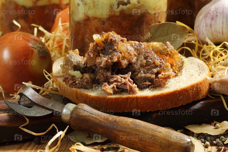 Тушенка свиная в стеклянных банках на деревянном столе
