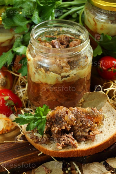 Тушенка свиная в стеклянных банках на деревянном столе