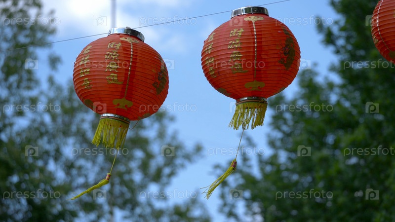 Китайский фестиваль красных фонарей на фоне зеленых деревьев и неба, Китайский фестиваль красных фонарей на фоне зеленых деревьев и неба