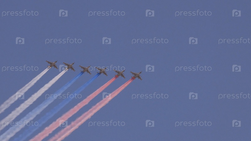 Штурмовики самолеты Су-25 летят в небе, оставляя за собой след дыма в виде трехцветного российского флага на тренировочном параде в честь победы в Великой Отечественной войне в мае