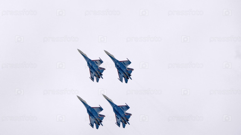 Москва Россия Аэродром Жуковский 25 июля 2021 года: Пилотажные группы Русские Витязи на самолетах Су-35 Международного аэрокосмического салона МАКС-2021