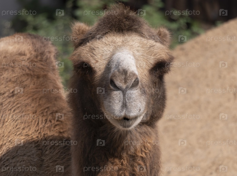 Портрет грациозного двугорбого верблюда, отдыхающего в тени
