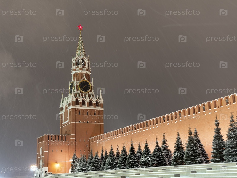 Спасская башня Московского Кремля на Красной площади зимой Москва Россия