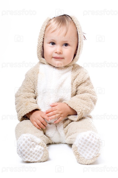 Милый ребенок в плюшевом костюме, изолированный над белым