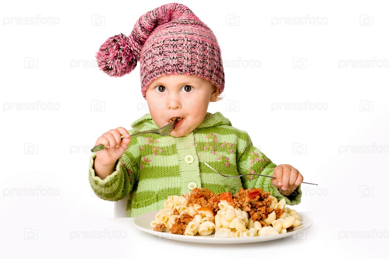 Красивый ребенок ест макароны, изолированные на белом фоне