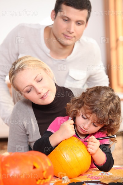 Семья вырезает тыкву
