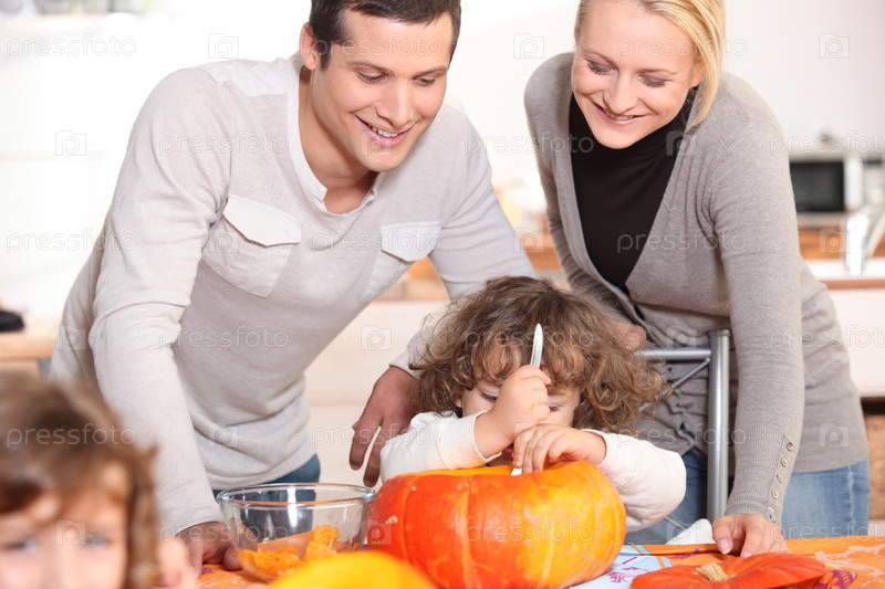 Семья вырезает тыкву