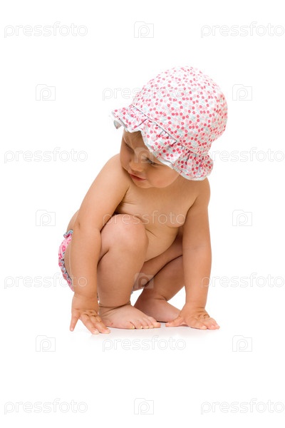Маленький ребенок сидит в шляпе от солнца, изолированный над белым