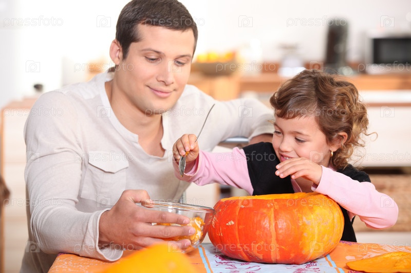 Отец и дочь вырезают тыквы