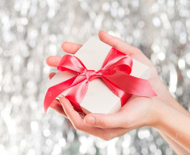 Белая подарочная коробка с красной лентой в руках на сверкающем фоне