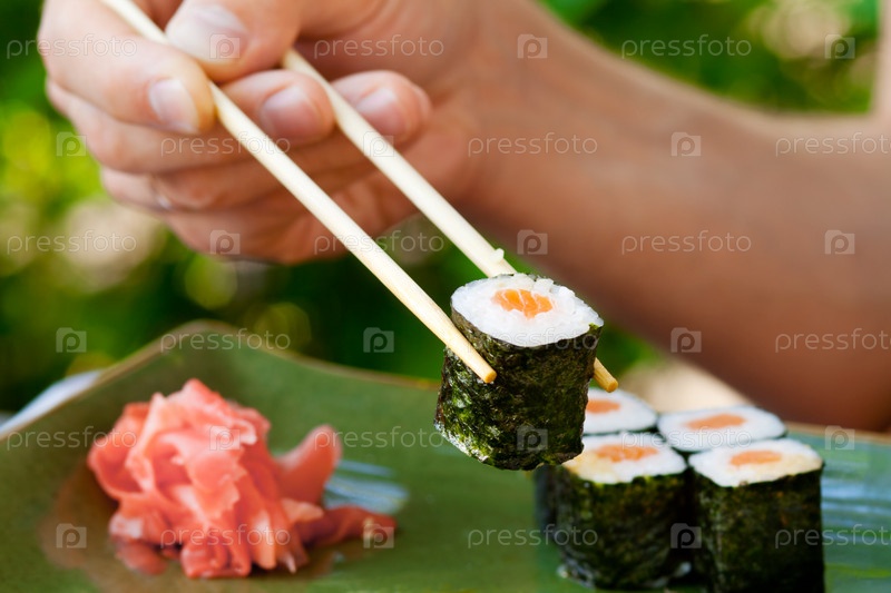 Мужская рука держит суши с палочками для еды, японские морепродукты