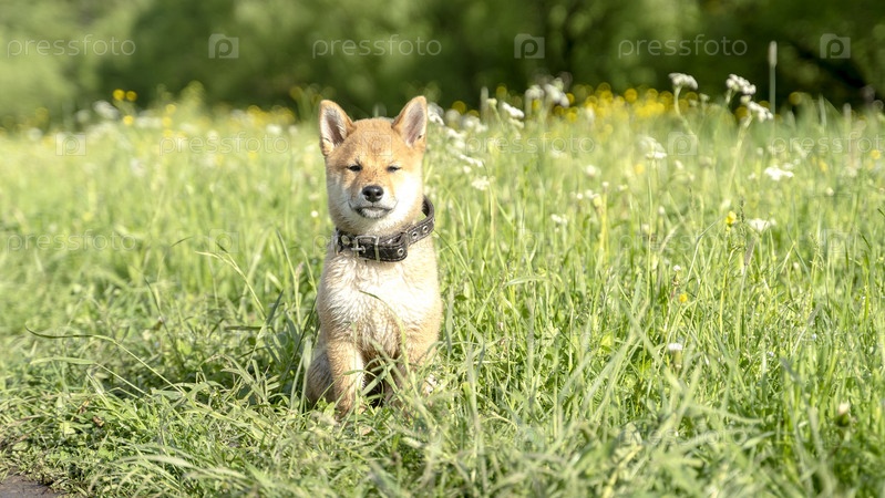 Крупный план Портрет красивого и счастливого рыжего щенка шиба-ину, сидящего летом на зеленой траве. Милая и сумасшедшая японская рыжая собака позирует на закате. Солнечный день