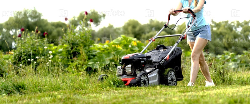 Девушка косит газон газонокосилкой
