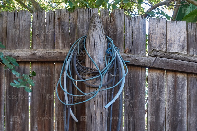 Старые провода висят на столбе забора. Старый деревянный покосившийся гнилой забор, на нем висят использованные провода и шланги